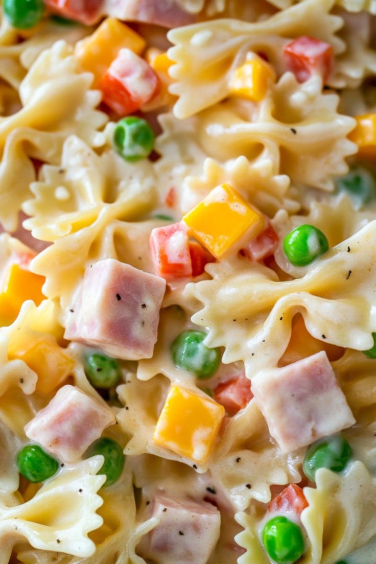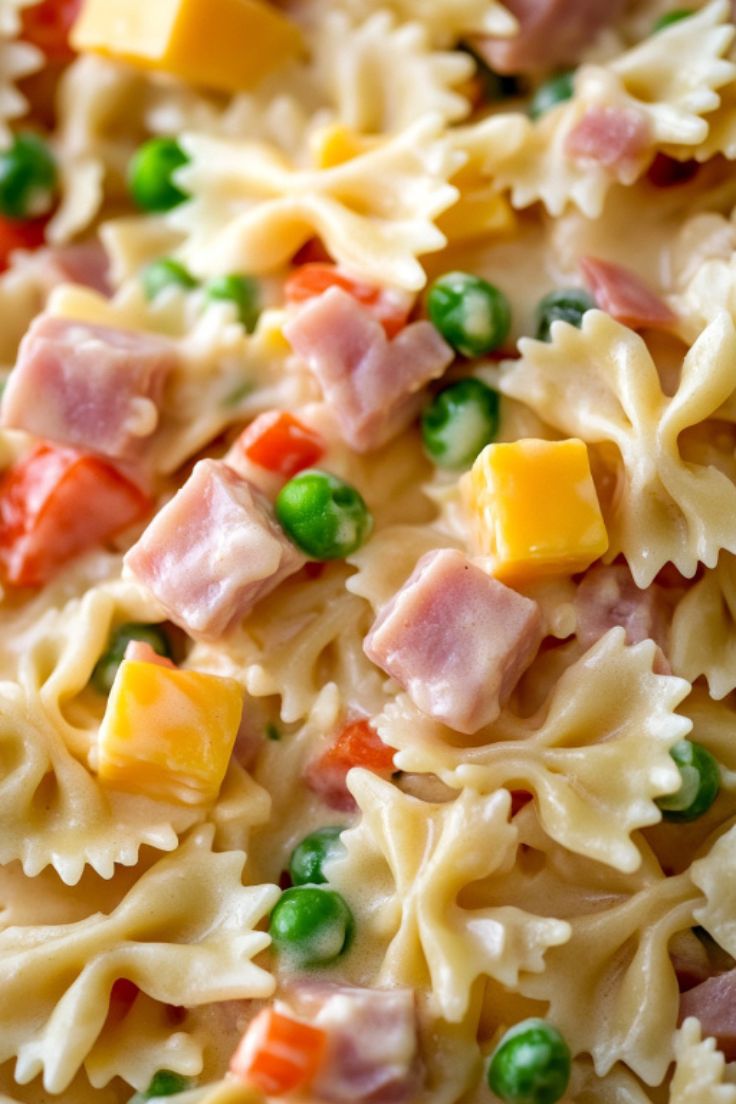 Creamy Bow Tie Pasta Salad with Cooked Chicken, Peas, and Cheddar Cheese